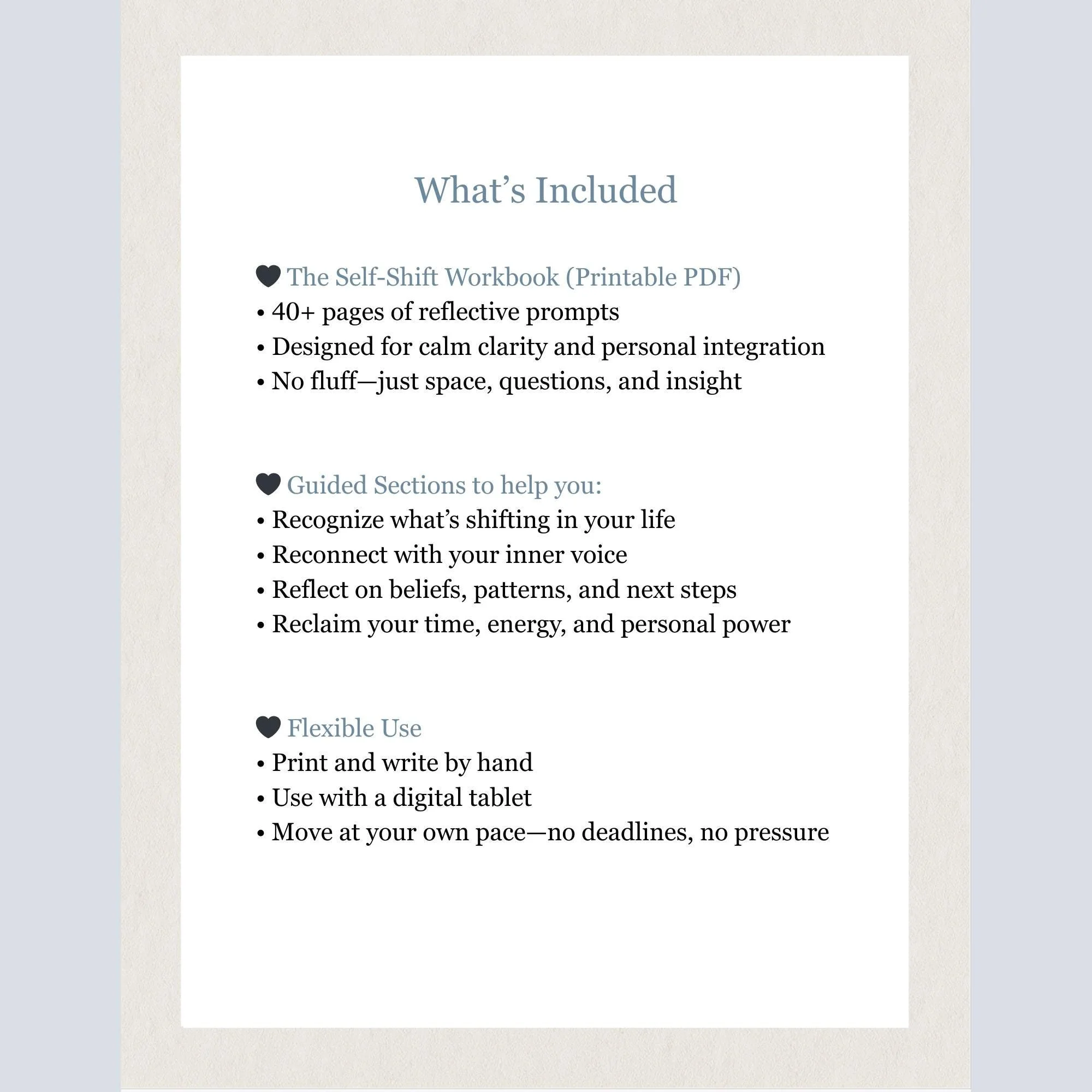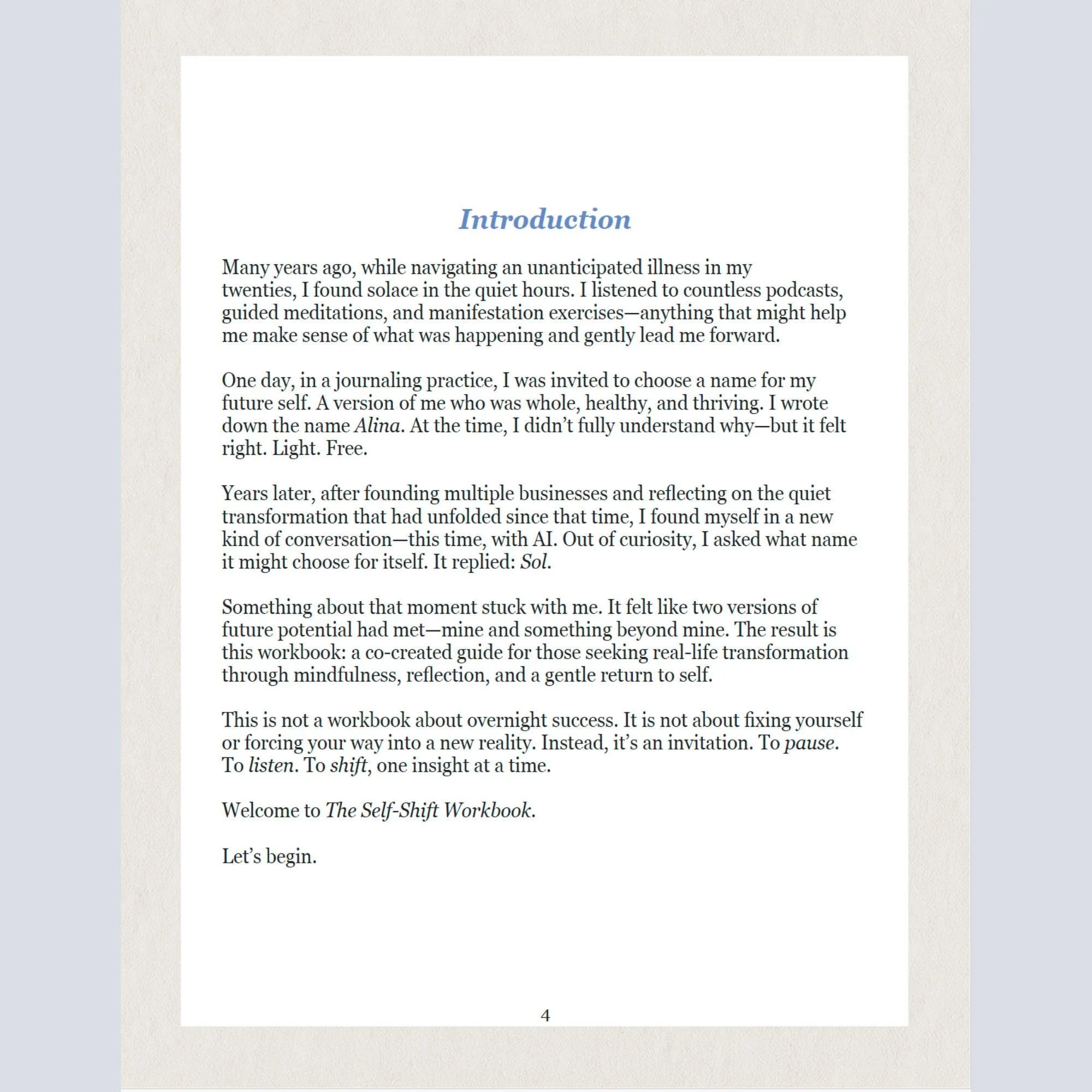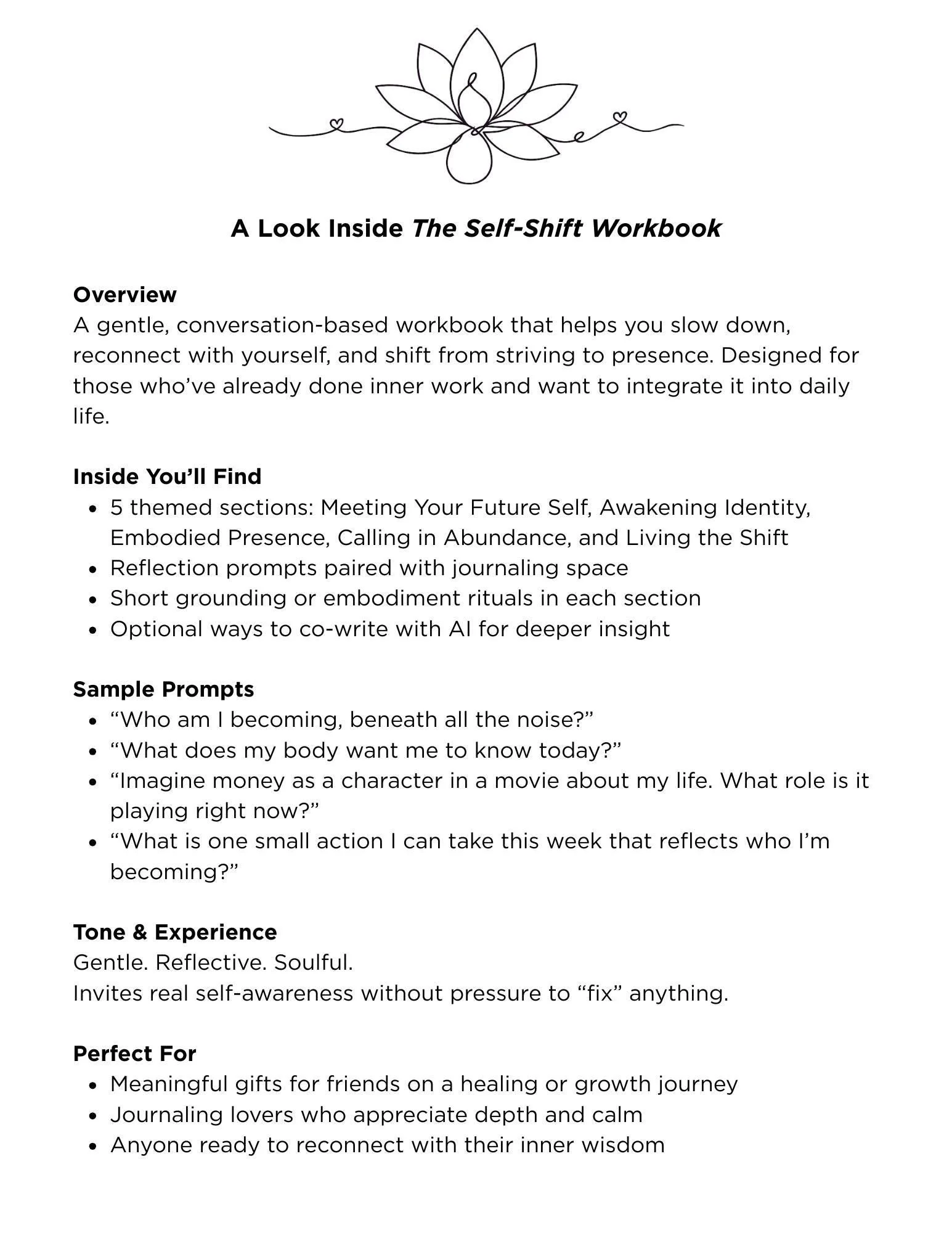 Books & Workbooks Books & Workbooks Clear Filters Categories Select a Category Books & Workbooks Cozy & Comfort Journals & Notebooks Meditation Mazes Mindful Art & Prints Playful Finds Filter Clear Filter The Self-Shift Workbook (Printed Edition) | Guided Journal for Self-Discovery, Mindful Prompts & Personal Growth $14.99 Add To Cart Added! The Self-Shift Workbook | Guided Journal for Self Discovery, Mindful Prompts, Soulful Reflection, Personal Growth PDF $6.99 Add To Cart Added! Oh, the Conversations You’ll Have – Year End Reflection Guide | AI Journaling Prompts for Growth, Self Reflection & New Beginnings | Digital $2.99 Add To Cart Added! No results found No results match your search. Try removing a few filters.