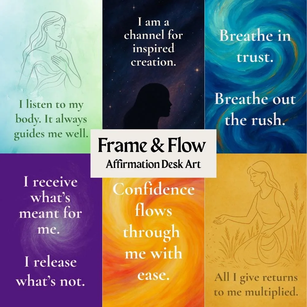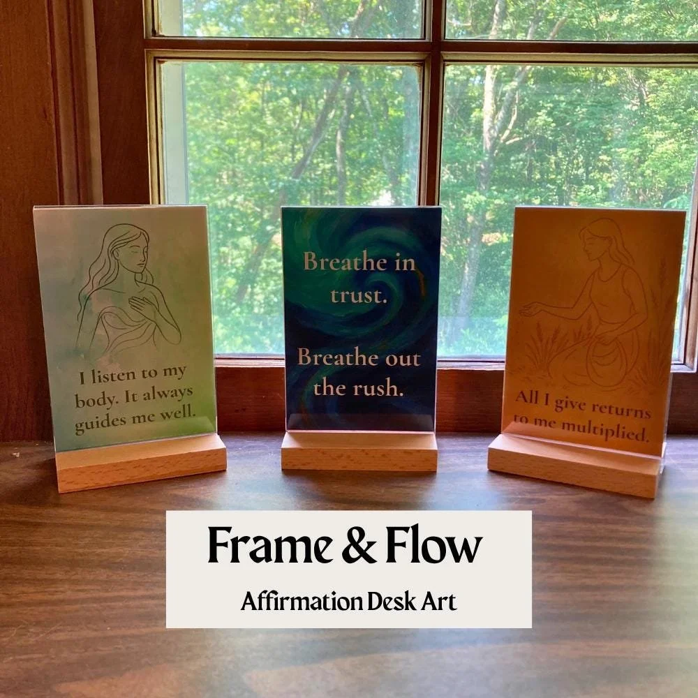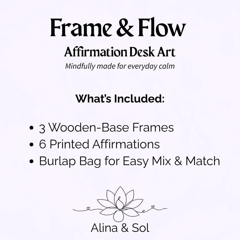 The Frame & Flow Set is a mindful twist on desk decor — 3 Wooden Frames (6 Affirmations Total), designed to shift with your mood or intention. Simply flip or swap them to reflect what you need most that day.